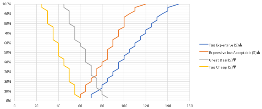 - Too Cheap Question: “At what price would you consider the product to be priced so low that you would feel the quality couldn’t be very good?”