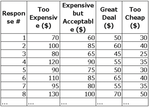 Looking at the “Expensive but Acceptable” column, anyone who listed a price lower than your new price ($70) would probably not buy. In this example, 3 out of 5 people (60%) would still buy at the $70 price point.