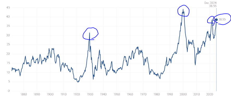 And it’s not just the Buffett Indicator raising red flags. Another key warning sign, the Shiller PE Ratio (which is the Price Earning Ratio of all S&P 500 (America’s 500 biggest public companies), measuring if stocks are overpriced compared to their actual earnings) hit 38.55 in December 2024, which is dangerously high. The last time it was this high was November 2021 at 38.58. Remember what happened after that? In 2022, the stock market crashed hard – tech giants dropped 30%, and some stocks even fell 50%.