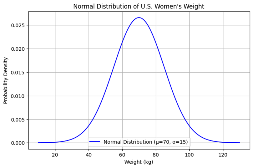 These potential patients must have above-average weight. Let’s suppose US women’s average weight is 70kg, and the standard deviation is 15kg (this means 68% of women fall between -15kg and 15kg: 55kg and 85kg), and the distribution follows a normal curve (which is common for natural phenomena). This gives us this graph.