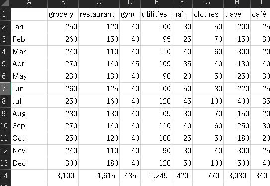 - Add up spending in each category (like total FOOD spending) using =SUM(