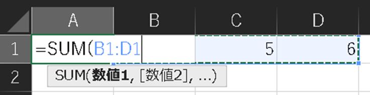 2. Select the cells you want to add up (just click and drag from B1 to D1)