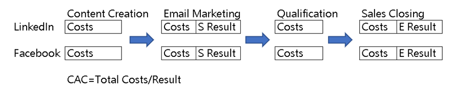 You need to calculate costs at each touchpoint. Here’s a simple example: Your target is both SMB and enterprise customers, and you only sell one product. You’re marketing on LinkedIn and Facebook. Both channels bring readers to a landing page and generate leads. Then you implement email marketing.  Enterprise customers typically require sales qualification and closing, while SMBs are self-service.